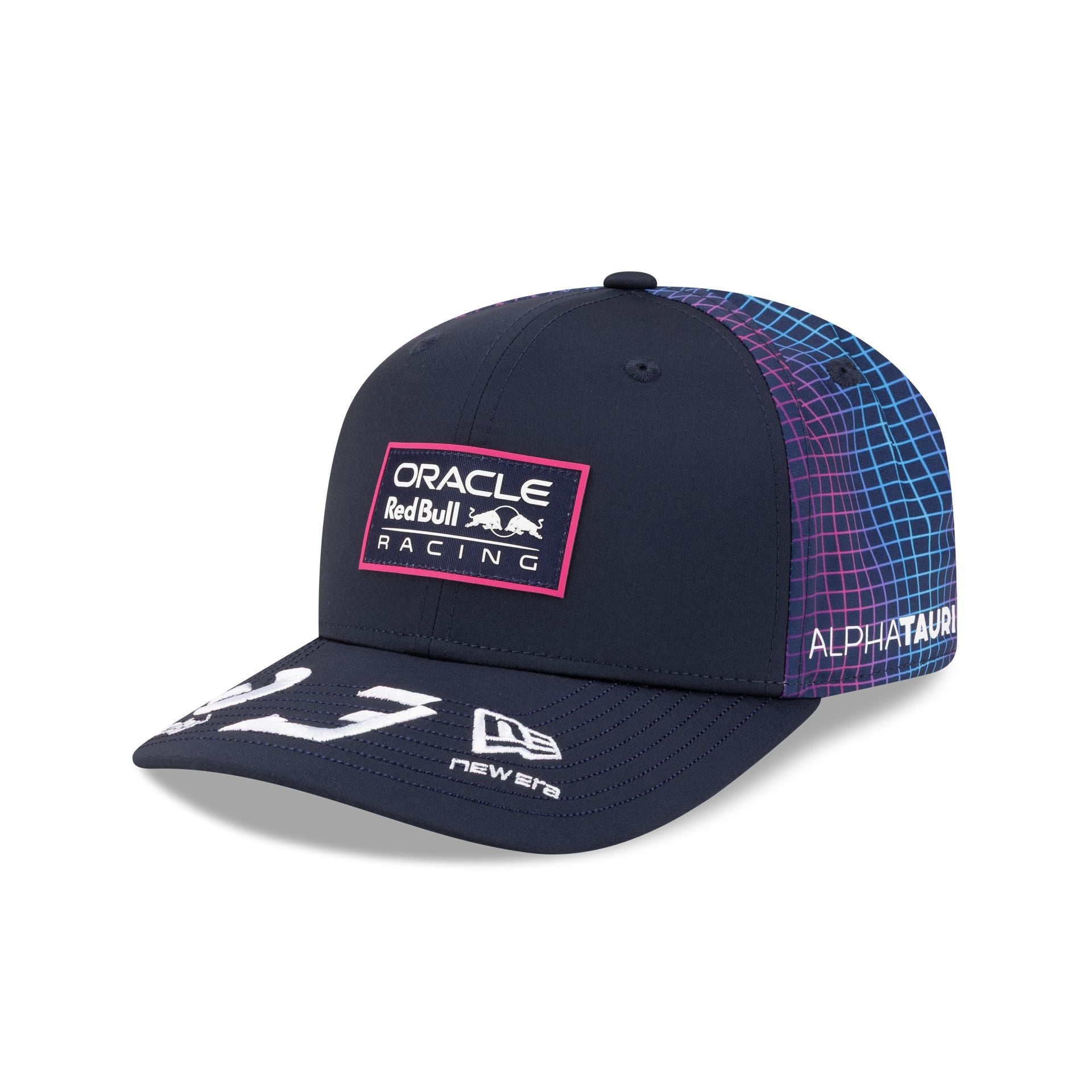 The 2026 Miami Race Special Max Verstappen Oracle Red Bull Racing 9SEVENTY Stretch-Snap Cap features a woven Oracle Red Bull Racing patch at the front panels with the driver's number and New Era Flag at the visor. Additional details include sponsor logos throughout the cap with a palm tree themed team logo above an adjustable stretch-snap closure at the patterned rear panels and a navy undervisor.