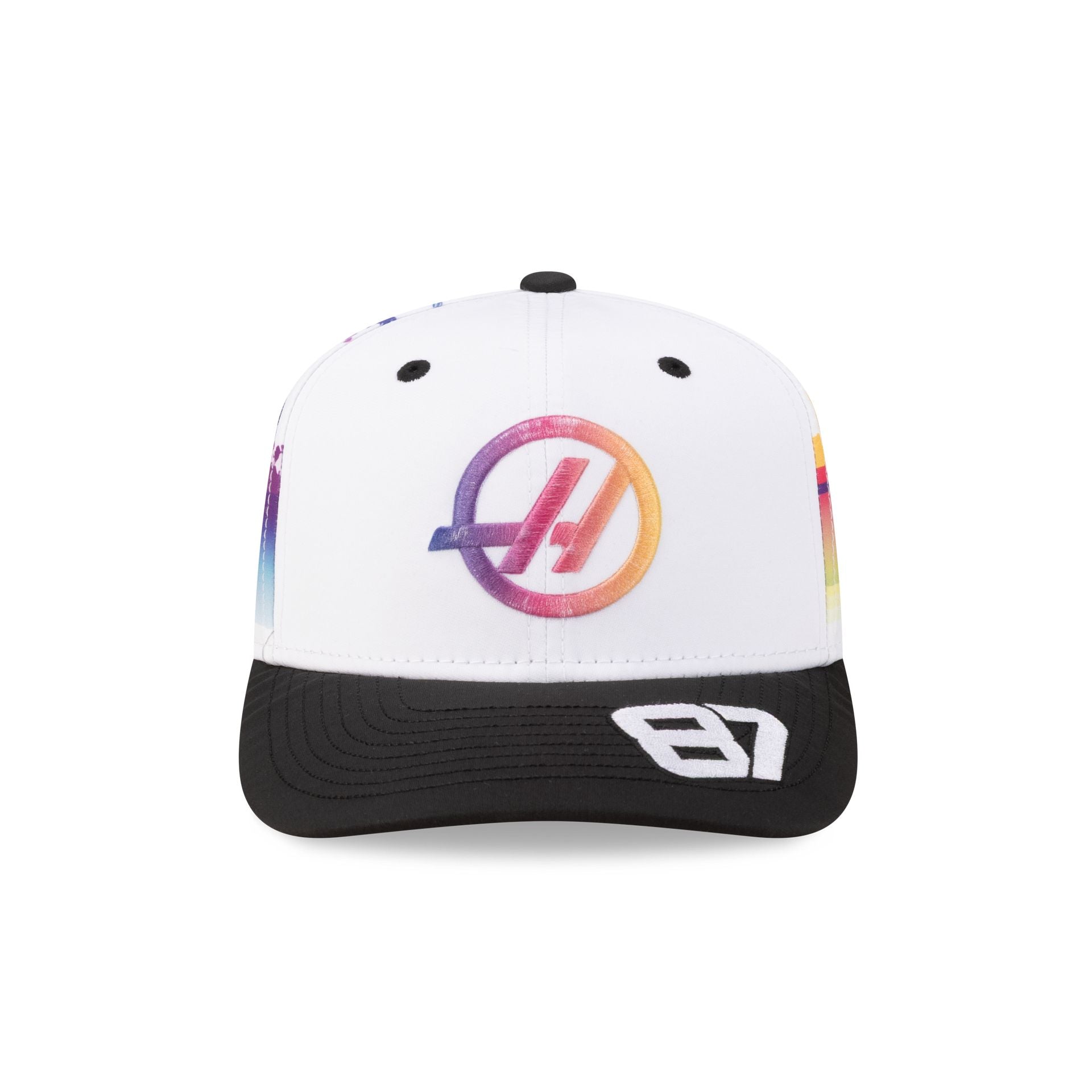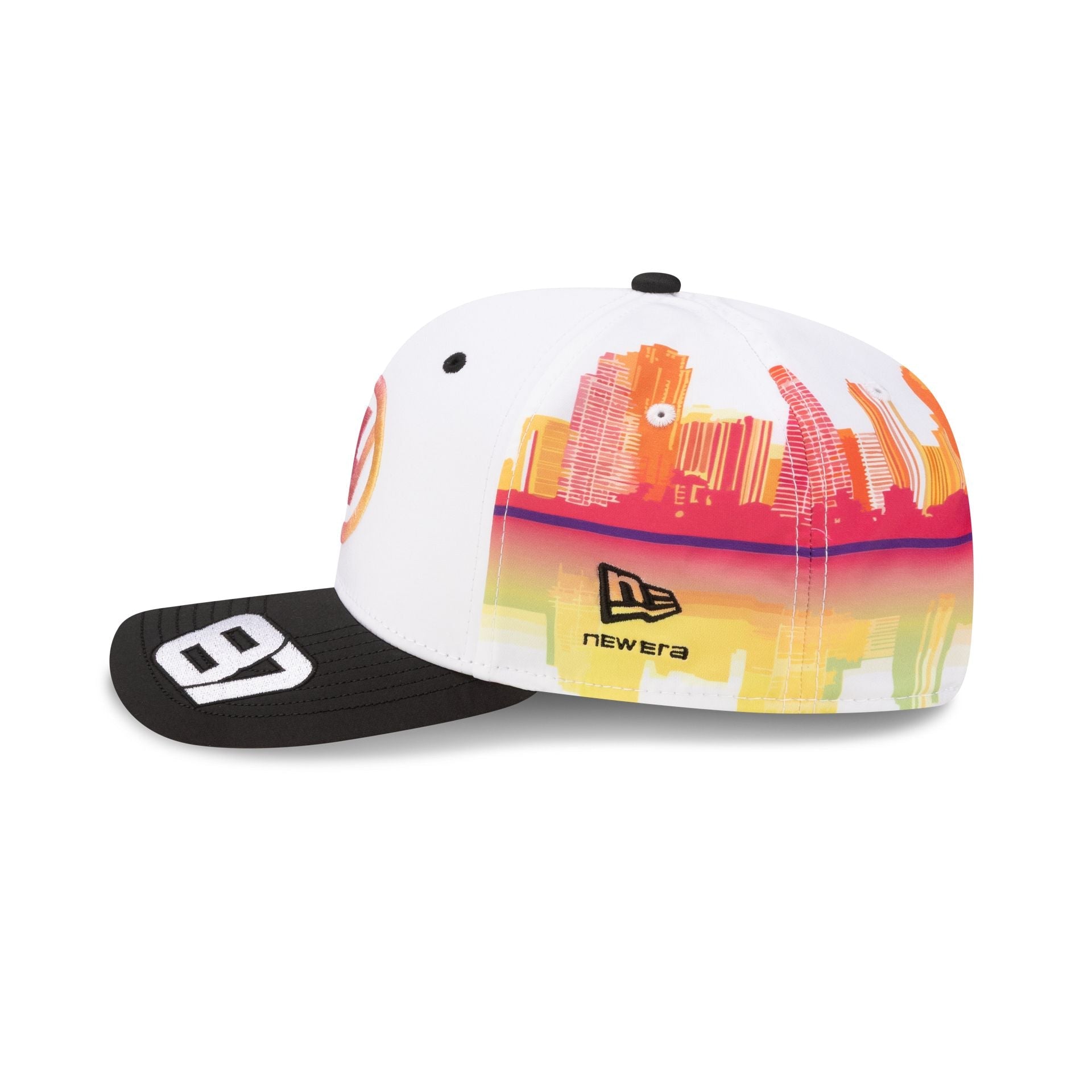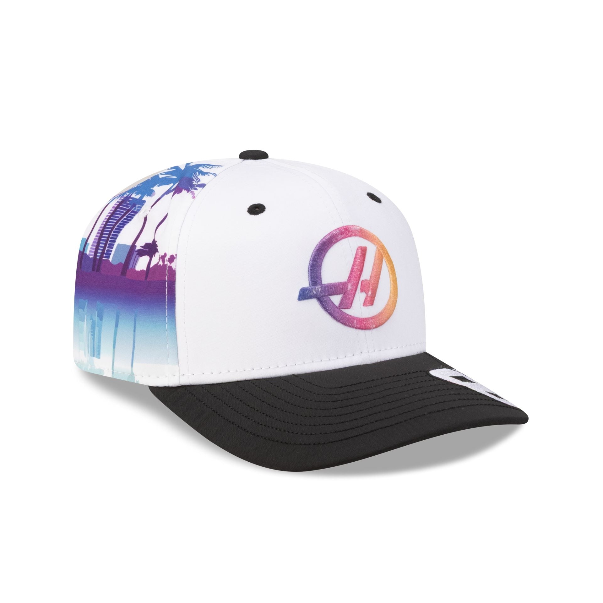 The 2026 Miami Race Special Oliver Bearman TGR Haas F1 Team 9SEVENTY Stretch-Snap Cap features an ombre effect embroidered Haas F1 Team logo at the front panels with the driver's number at the black visor and an adjustable stretch-snap closure at the rear. Additional details include a woven MEROS tag above a New Era Flag at the left-wear side with a Miami skyline graphic at the rear panels and a gray undervisor.
