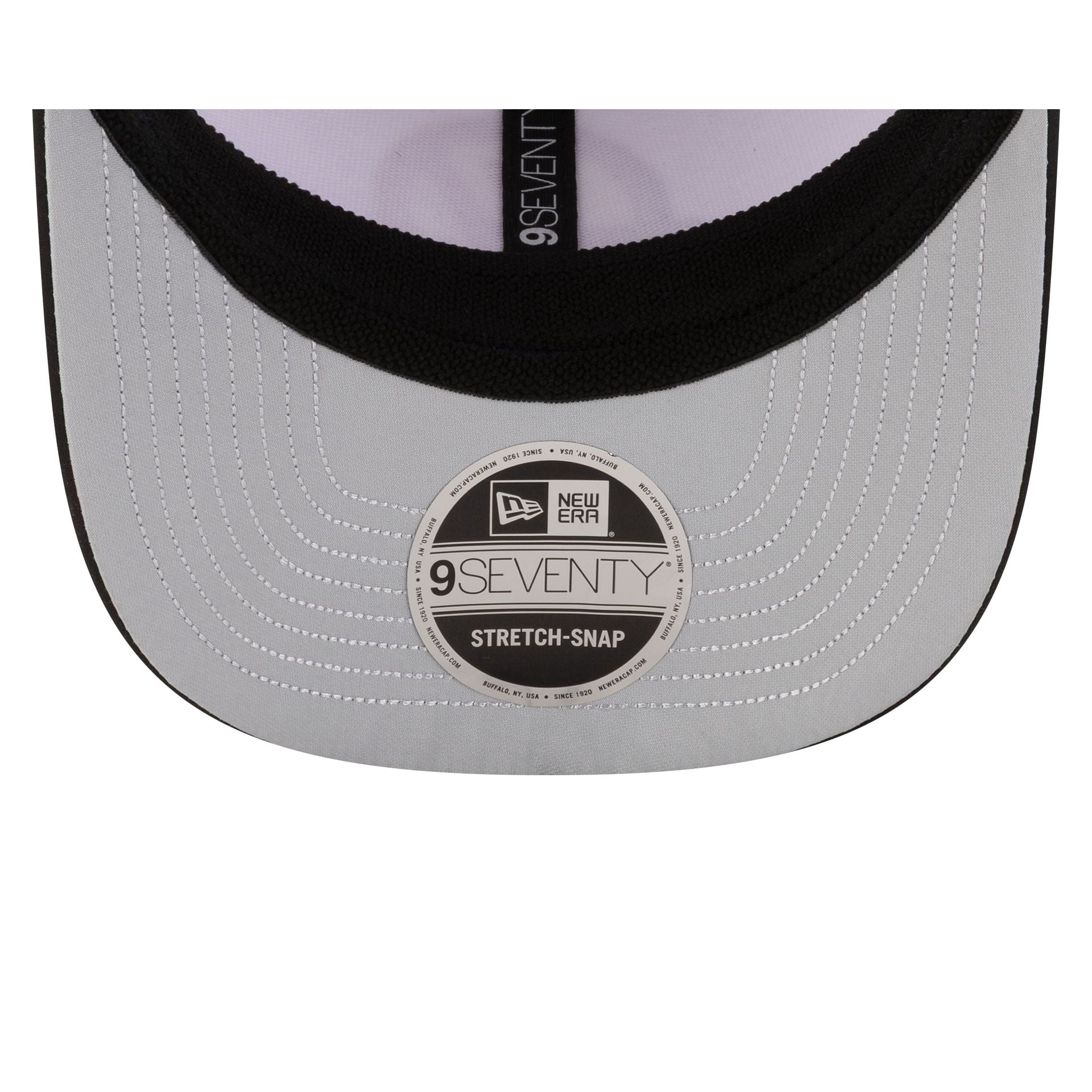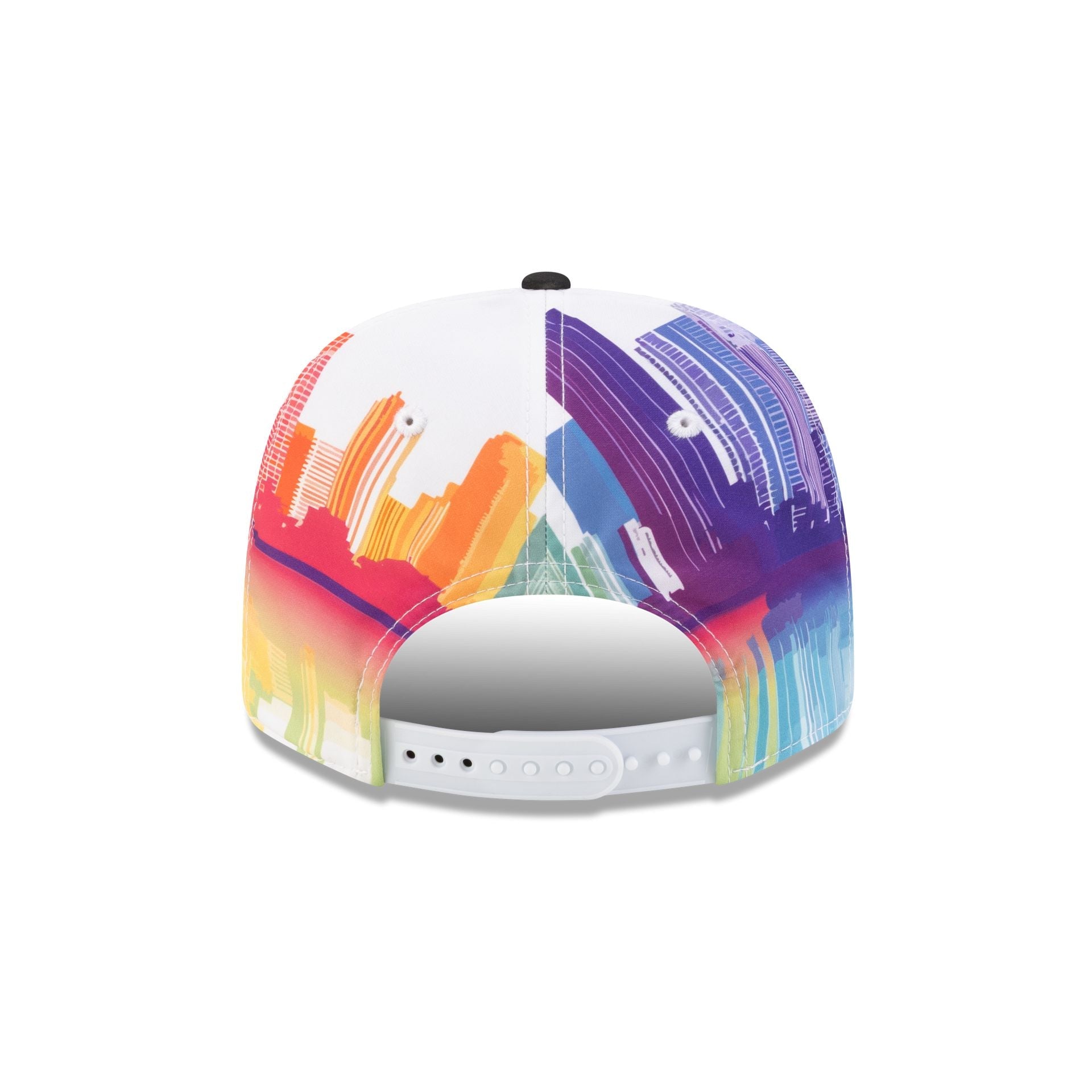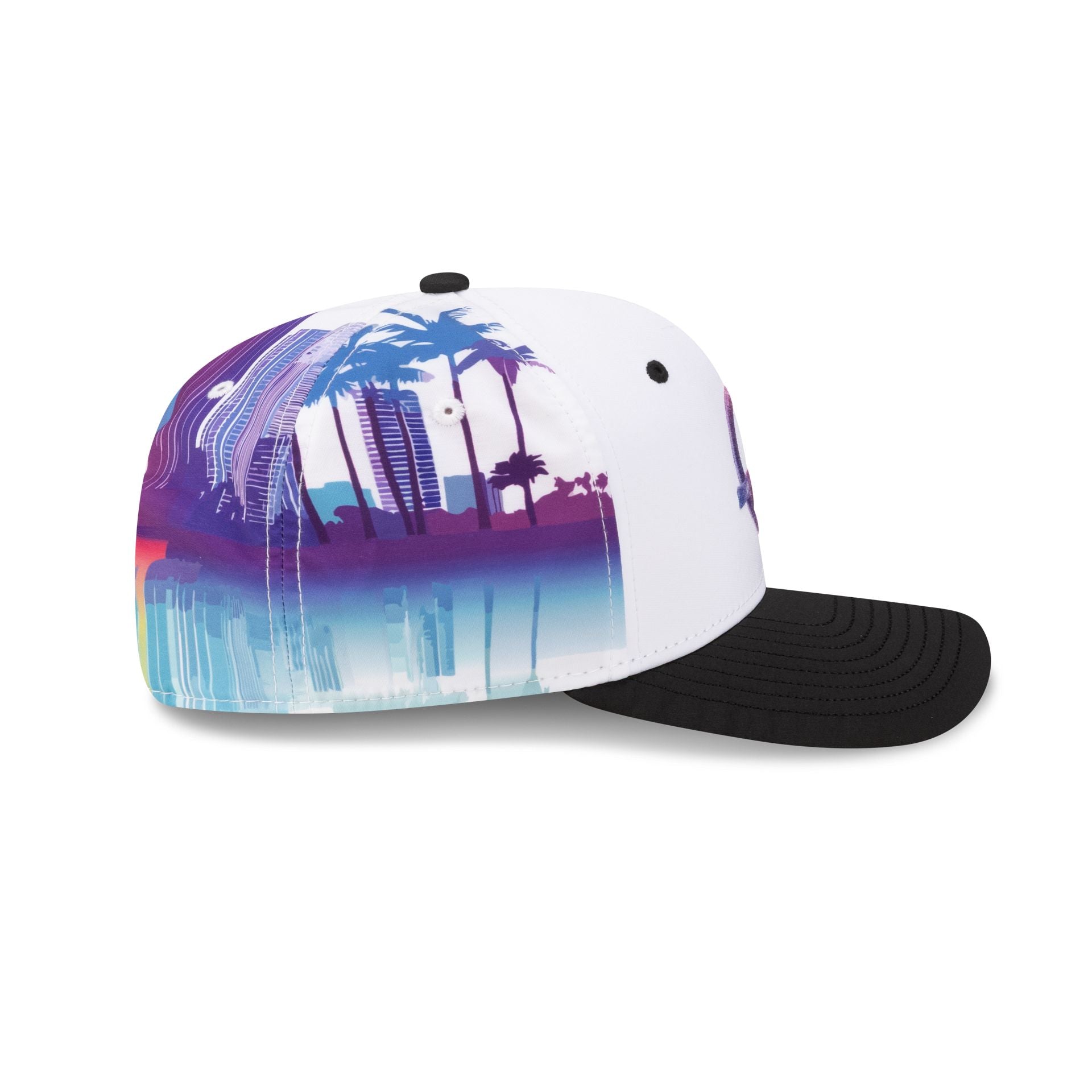 The 2026 Miami Race Special Oliver Bearman TGR Haas F1 Team 9SEVENTY Stretch-Snap Cap features an ombre effect embroidered Haas F1 Team logo at the front panels with the driver's number at the black visor and an adjustable stretch-snap closure at the rear. Additional details include a woven MEROS tag above a New Era Flag at the left-wear side with a Miami skyline graphic at the rear panels and a gray undervisor.